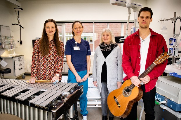 Region Midtjylland har flere forsøg med kultur på hospitalerne. Fx musik på intensivafdelingen på AUH. Her ses fra venstre konservatoriemusikeren Ninna Morsing, afdelingssygeplejerske Linette Thorn, tidligere patient Birgitte Bredsdorff og konservatoriemusiker Frederik Sandfeld. Foto. Tonny Foghmar, Region Midtjylland.